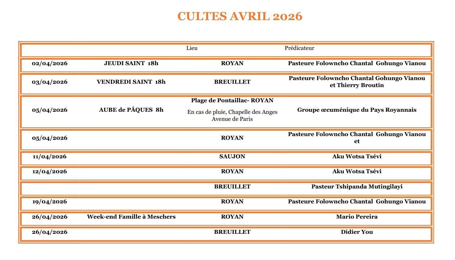 CULTES AVRIL 2026
